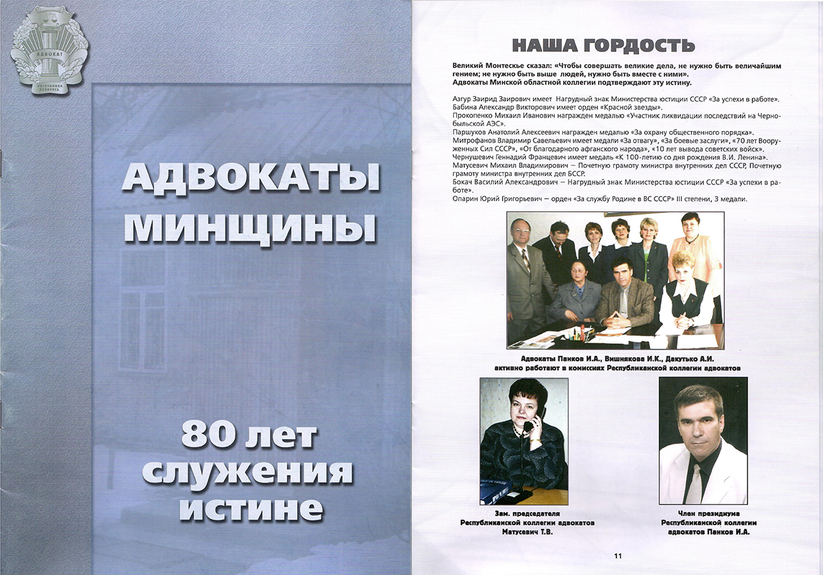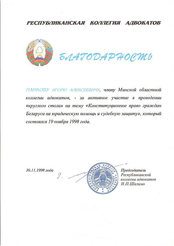 Панков Игорь Алексеевич состоял в Минской областной коллегии адвокатов с 18 марта 1996 года вплоть до своего ухода из жизни, то есть почти 30 лет.