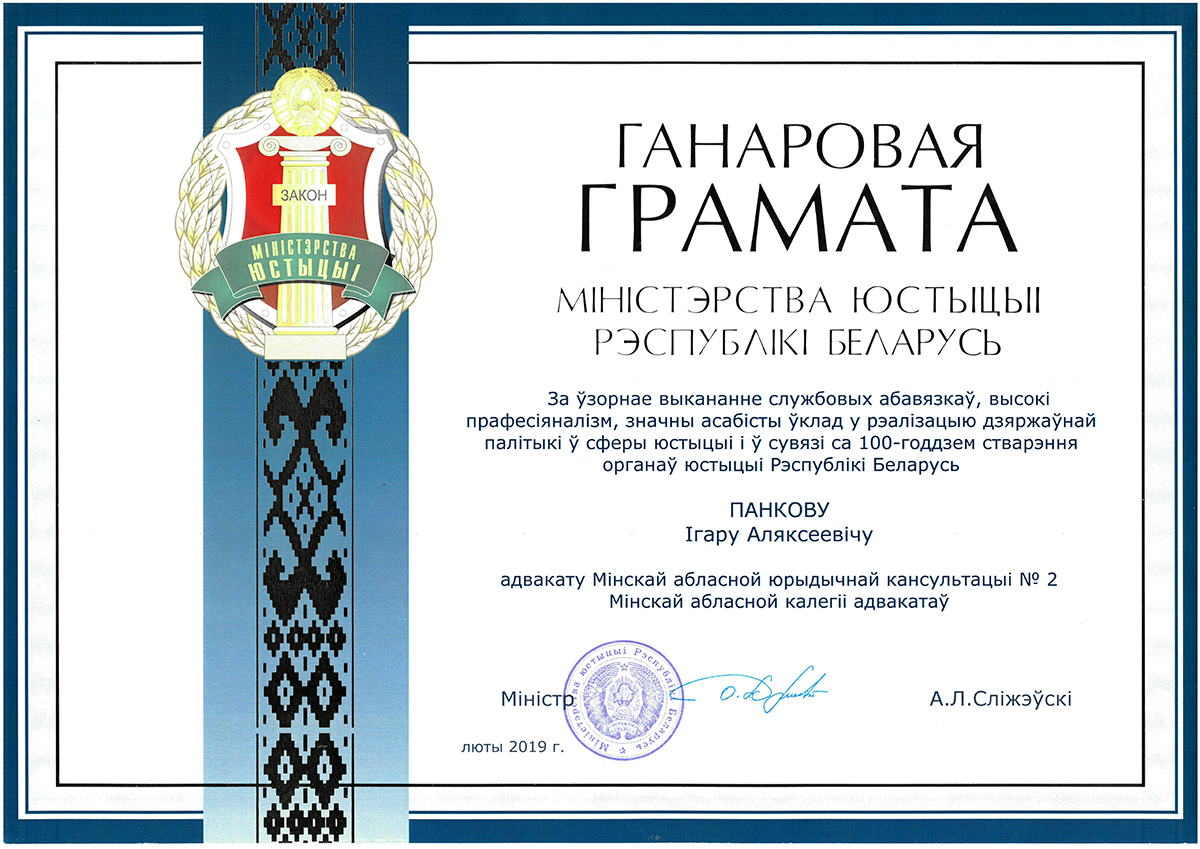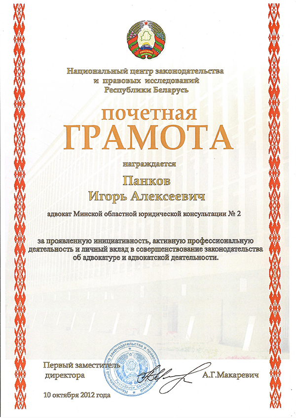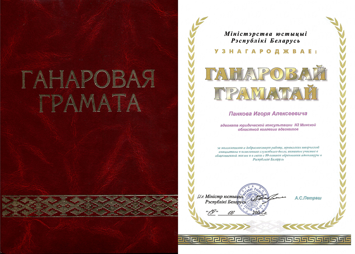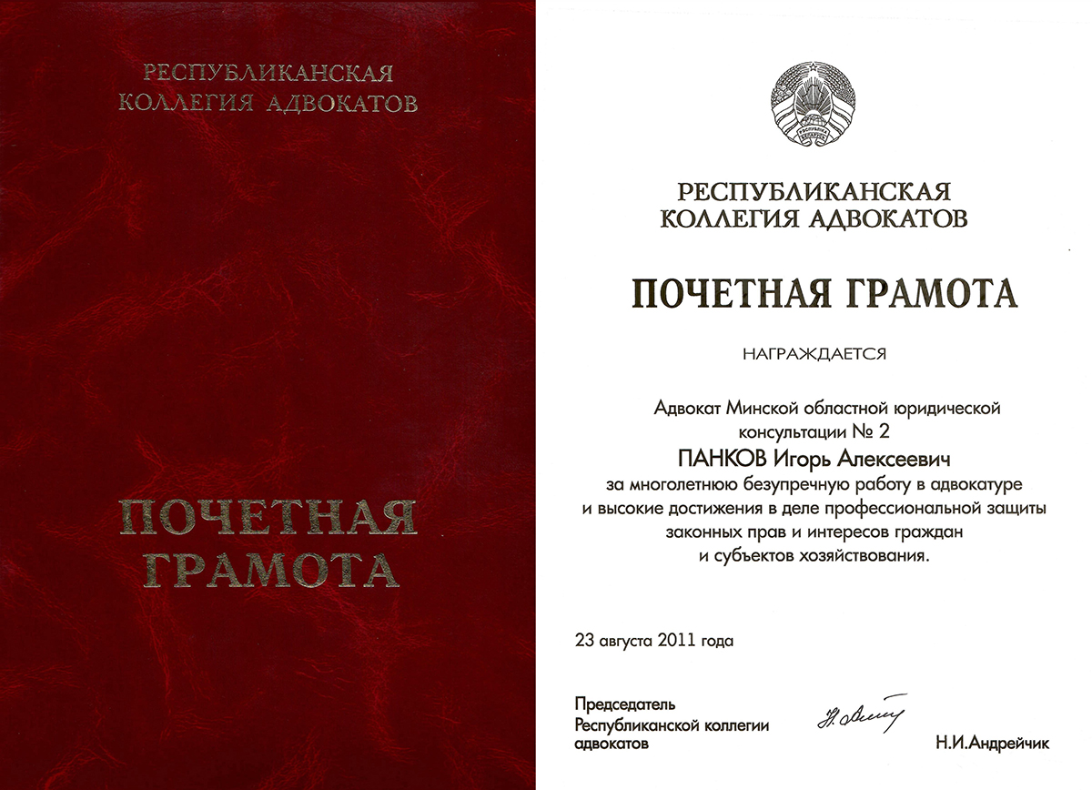 За высокие достижения в деле профессиональной защиты законных прав и интересов граждан и субъектов хозяйствования Панков Игорь Алексеевич неоднократно награждался Почетными грамотами Белорусской республиканской и Минской областной коллегий адвокатов. На данной странице приведены лишь некоторые грамоты.