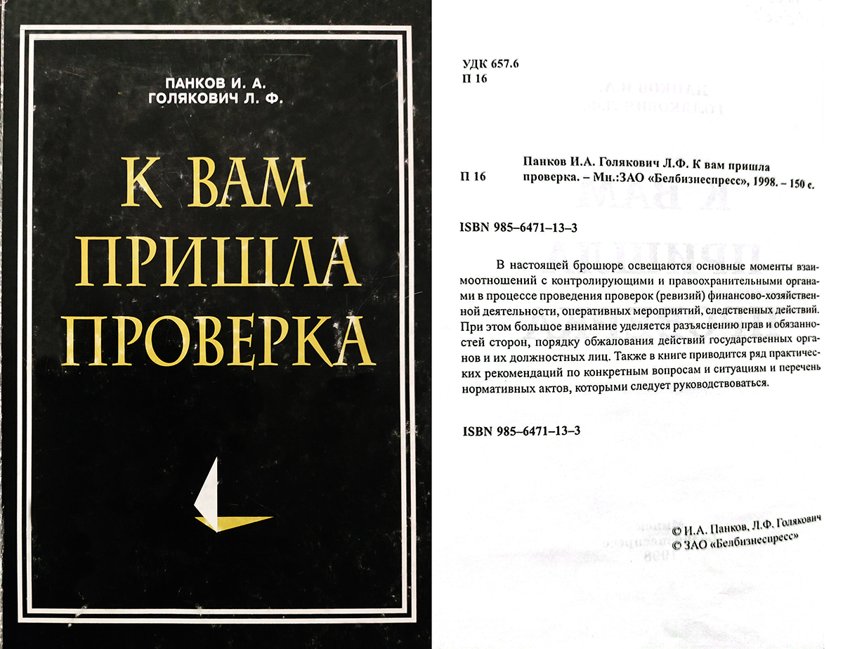 Панков И.А., Голякович, Л. Ф. К вам пришла проверка. - Мн. : ЗАО "Белбизнеспресс", 1998. - 147, [1] с. УДК: 336.2.02(476)(094) _ 351.74(476)(094). ISBN: 985-6471-13-3. ГРНТИ: 06.75.39 _ 10.79.91 _ 10.71.91. Тираж: 1000 экз.